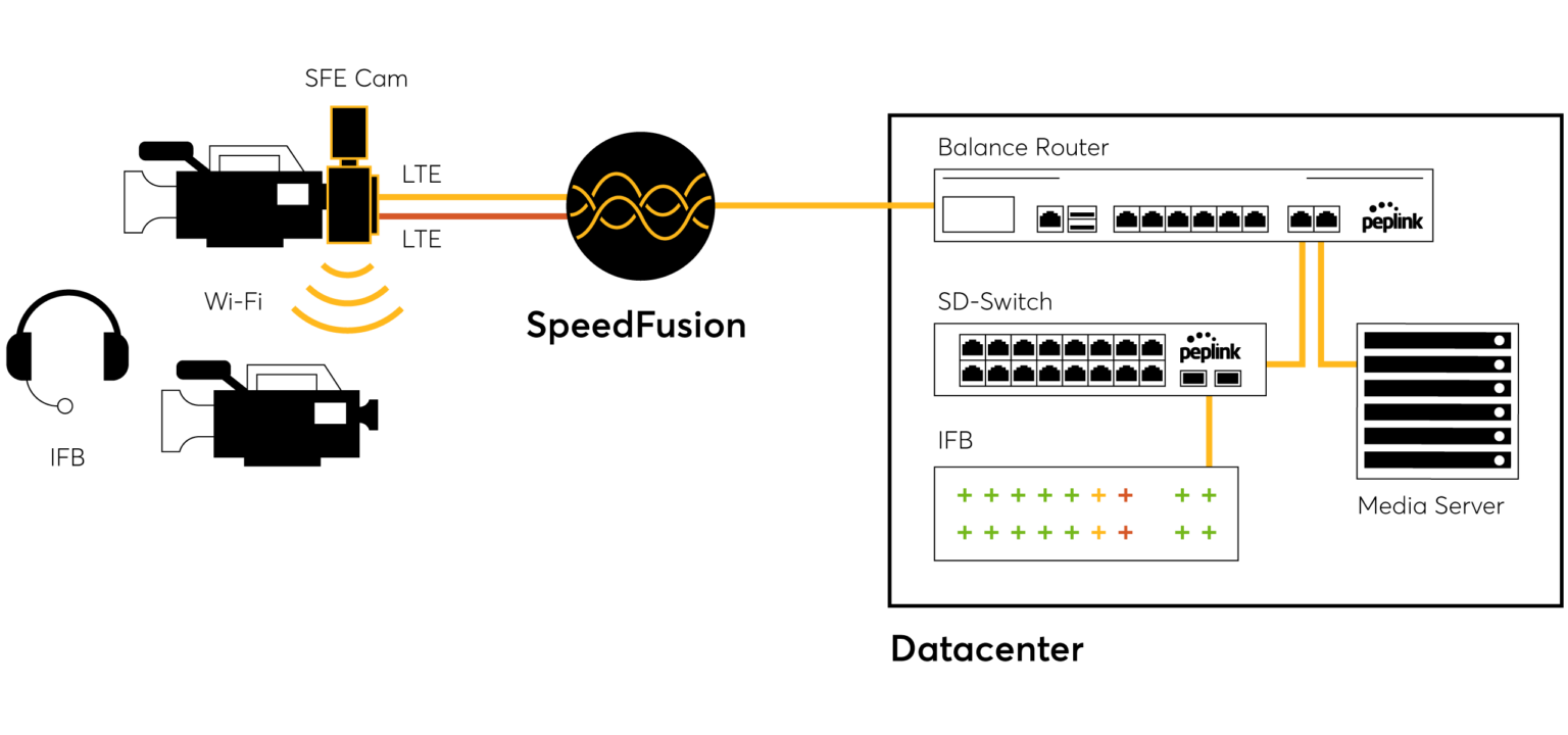 - In this deployment, the SpeedFusion Engine Cam (SFE Cam) streams the video to the datacenter using the combined bandwidth of two LTE connections, ensuring reliable and consistent connectivity. The video stream is received by a Balance router at the datacenter and forwarded to the media server for decoding and post-processing. Within the SpeedFusion connection, WAN Smoothing and FEC mitigate the effects of packet loss, ensuring smooth and consistent video streaming. Each cellular connection supports a redundant SIM card, so you can choose between four carriers.