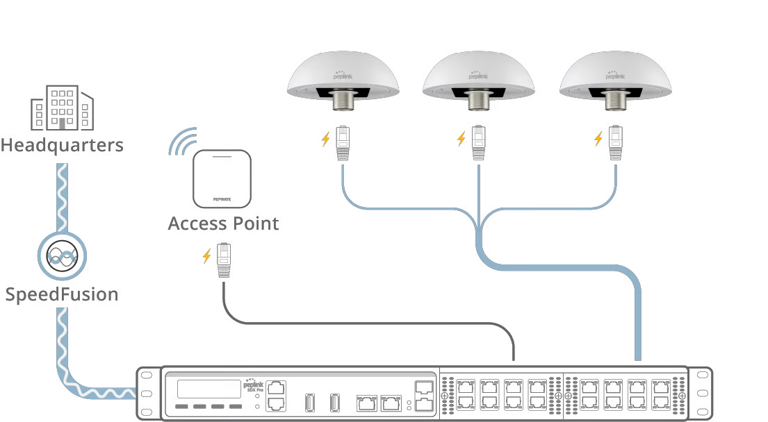 The HD1 Dome Pro can optimize network performance with its PoE functionality. Leverage the power of SpeedFusion by simply connecting Peplink PoE routers, for a mega-bandwidth channel, with the simplest failover option. Or alternatively, extend the Wi-Fi range by connecting an external access point.