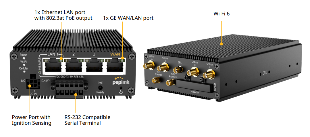 The Peplink Transit Pro E is a rugged mobile 5G router with Edge Compute Engine. The Peplink router provides a fast and stable 5G internet connection with speeds of up to 3.4 Gbps download and 900Mbps upload. The Transit Pro E is backwards compatible with 4G LTE CAT-20.